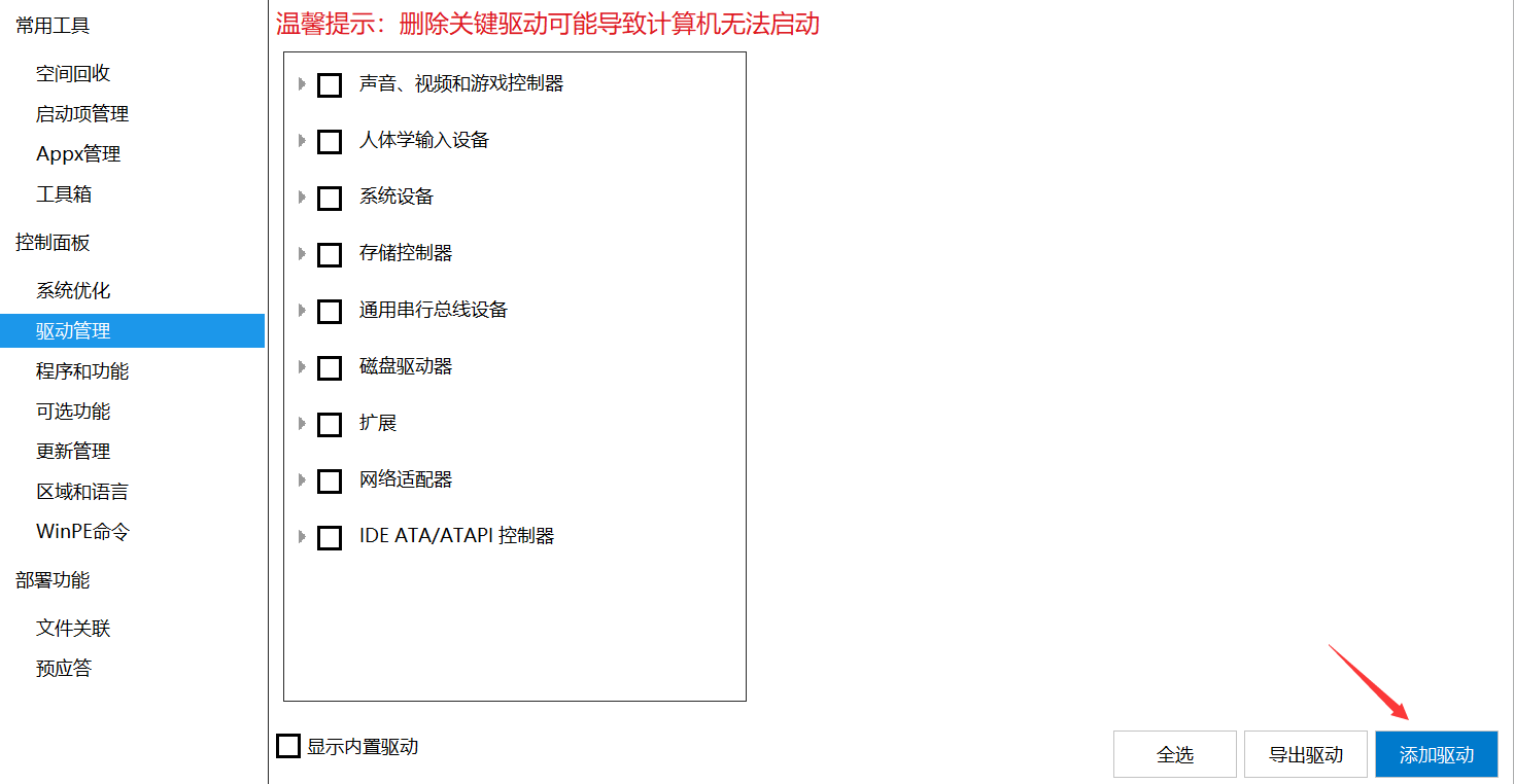 4、点一下左侧的"驱动管理",然后点右下侧的"添加驱动",选择腾讯云Win11驱动的位置