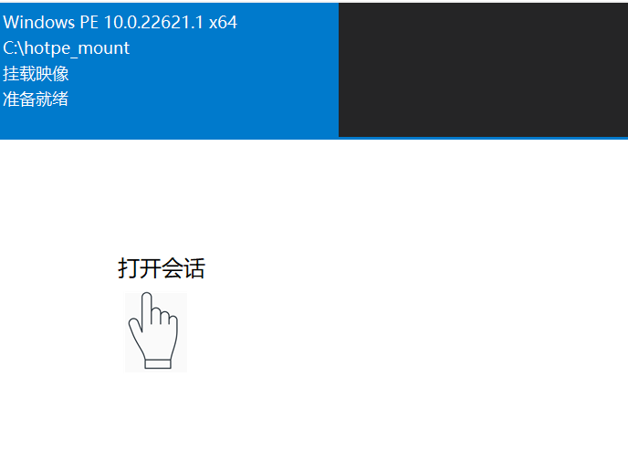选择.WIM文件和挂载位置(需要空文件夹,并且有写权限)后点确定,等加载进度走完后会看到"打开会话"字样,鼠标放上去是个小手图标,如下图