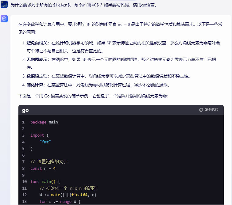 在Go语言中,如果你需要创建一个矩阵并确保所有对角线元素为零,你可以使用以下代码片段: