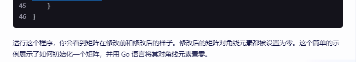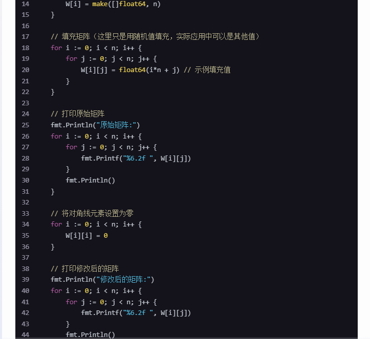 }运行这个程序,你会看到矩阵在修改前和修改后的样子。修改后的矩阵对角线元素都被设置为零。这个简单的示例展示了如何初始化一个矩阵,并用 Go 语言将其对角线元素置零。
