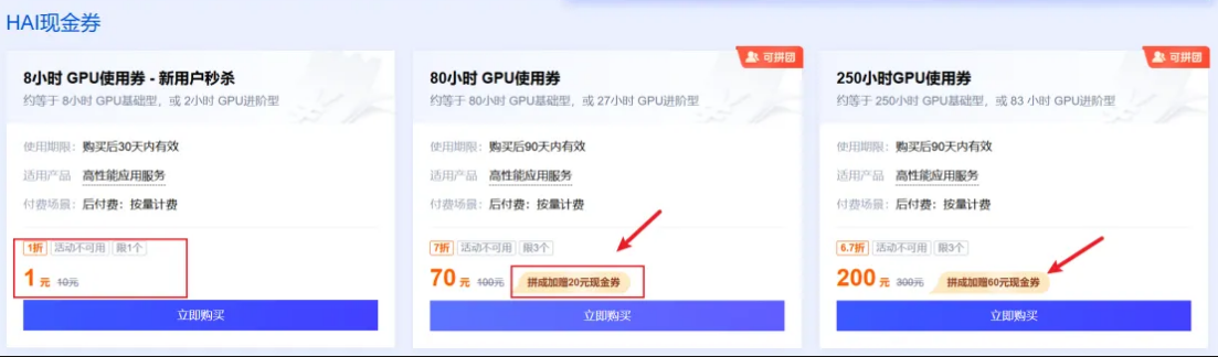 250小时GPU使用券 | 200元 拼团(赠送随机60优惠券) |