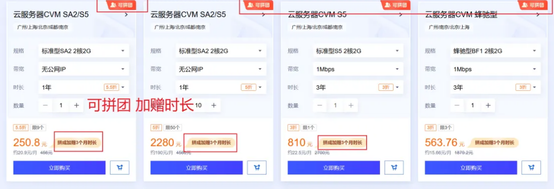 总的来说,腾讯云针对不同云服务器产品提供了丰富的优惠措施,包括拼团加赠时长以及团购5折优惠。用户可以根据自身需求选择合适的产品并享受优惠。