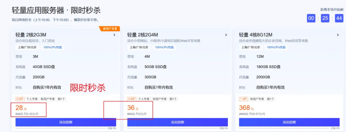 三款不同配置的轻量应用服务器产品,价格从28元/月起