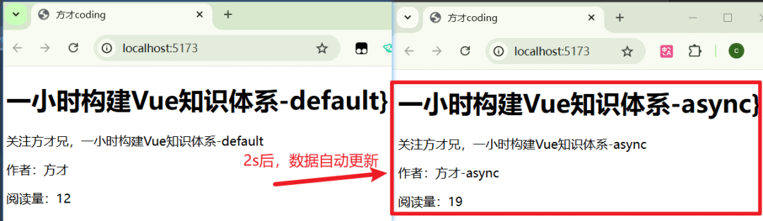 直接运行项目,效果就是,最初展示xx-default的文章内容,2s后【实际API请求会这个快很多的,只是为了更好的演示效果】,数据会被更新,自动渲染xx-async的内容: