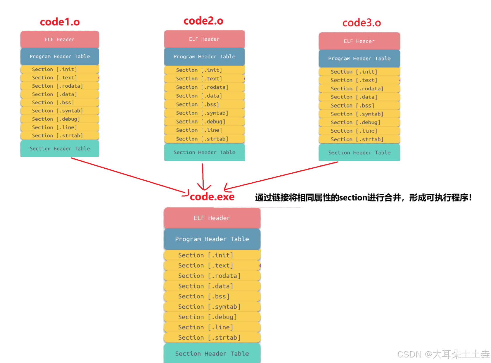 因为目标文件.o也是ELF格式,那么将目标文件链接为可执行程序实际上就是将相同属性的section合并: