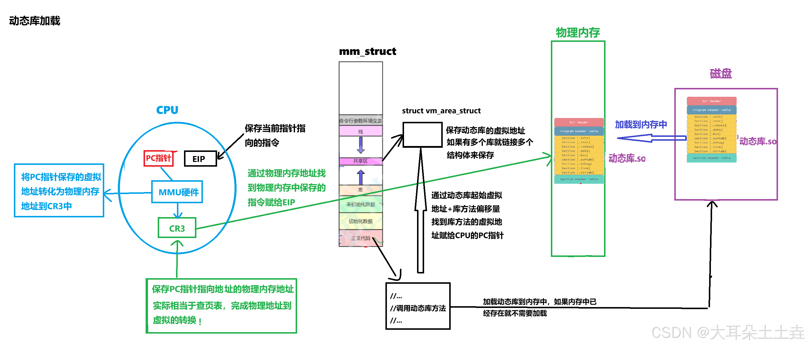 动态库的加载与可执行程序类似,但是它并不直接将虚拟地址保存到mm_struct中,而是在程序运行需要用到动态库时加载到内存中,并将自己的虚拟地址保存到一个结构体struct vm_area_struct中,因为动态库加载可能多个也可能不加载,所有Linux使用了一种灵活的数据结构来保存动态库的虚拟地址,该结构体实际上是一个链表,链接在mm_struct中的共享区中。