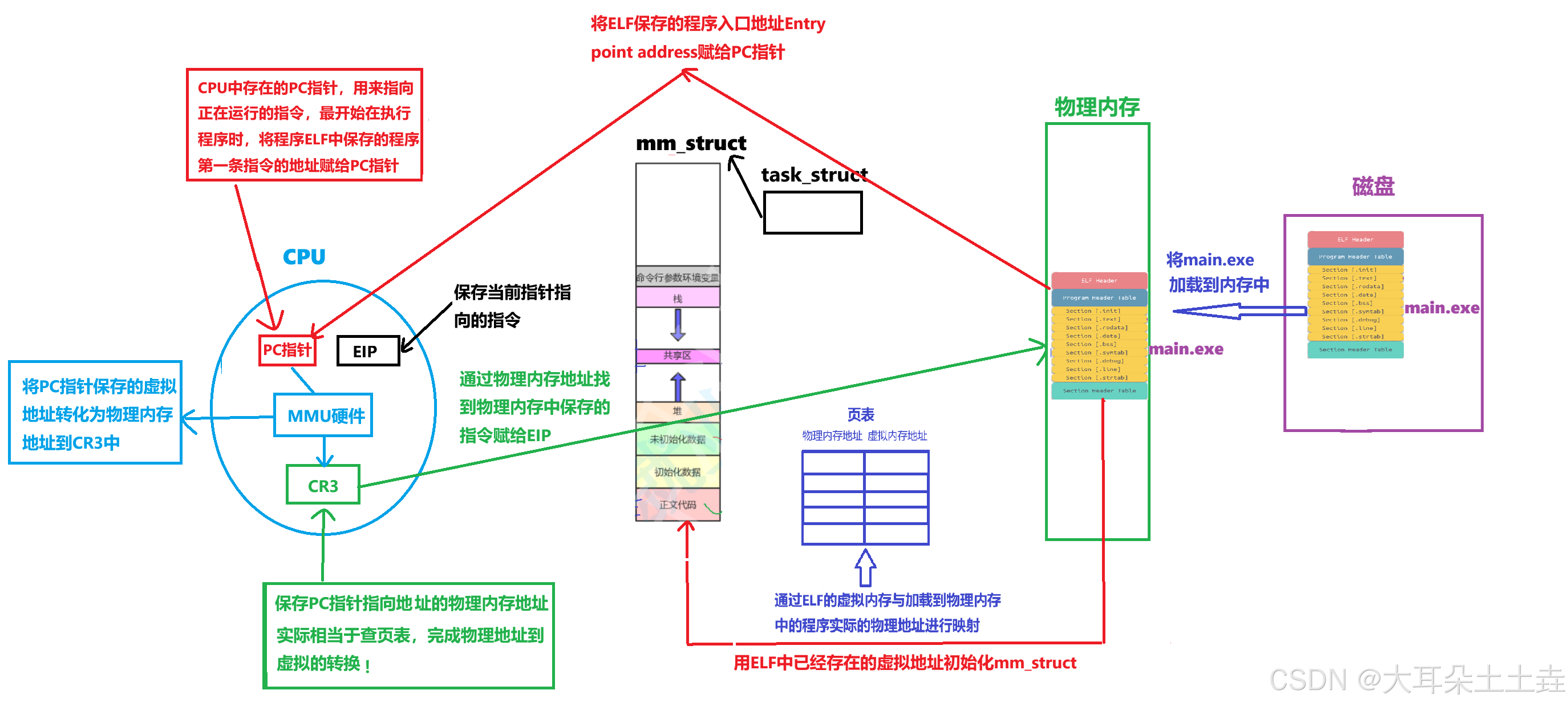此外可执行程序ELF中还保存了整个程序的入口地址Entry point address,这样当系统执行程序时,除了将ELF中的虚拟地址加载到mm_struct中,还会将整个程序的入口地址赋给CPU的pc指针,(pc指针指向当前执行的命令)这样一个程序就可以执行下去了,所以执行程序使用的地址也是虚拟地址。