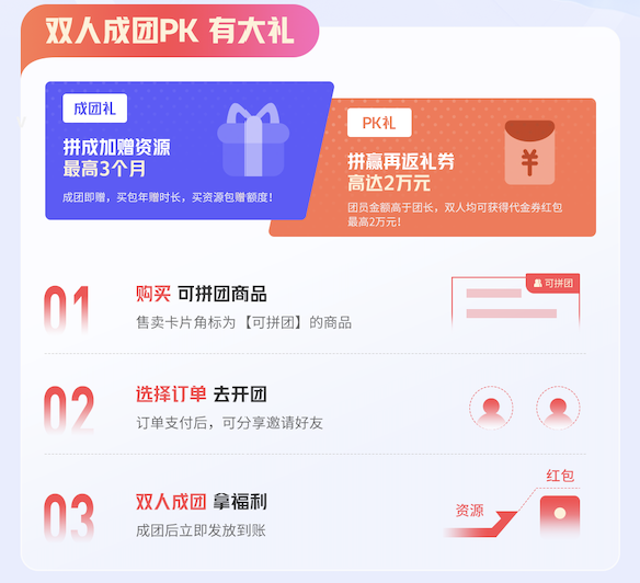 3. 参与拼团活动可获得「成团礼」和「PK礼」。「成团礼」只要成团,全员即送,买包年包月赠时长,买资源包赠额度;「PK礼」 团员的订单金额>团长的订单金额,全团即可获得最高2W元代金券。