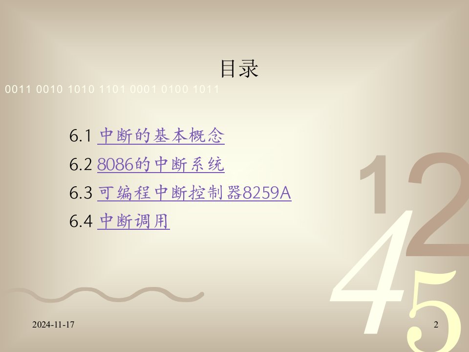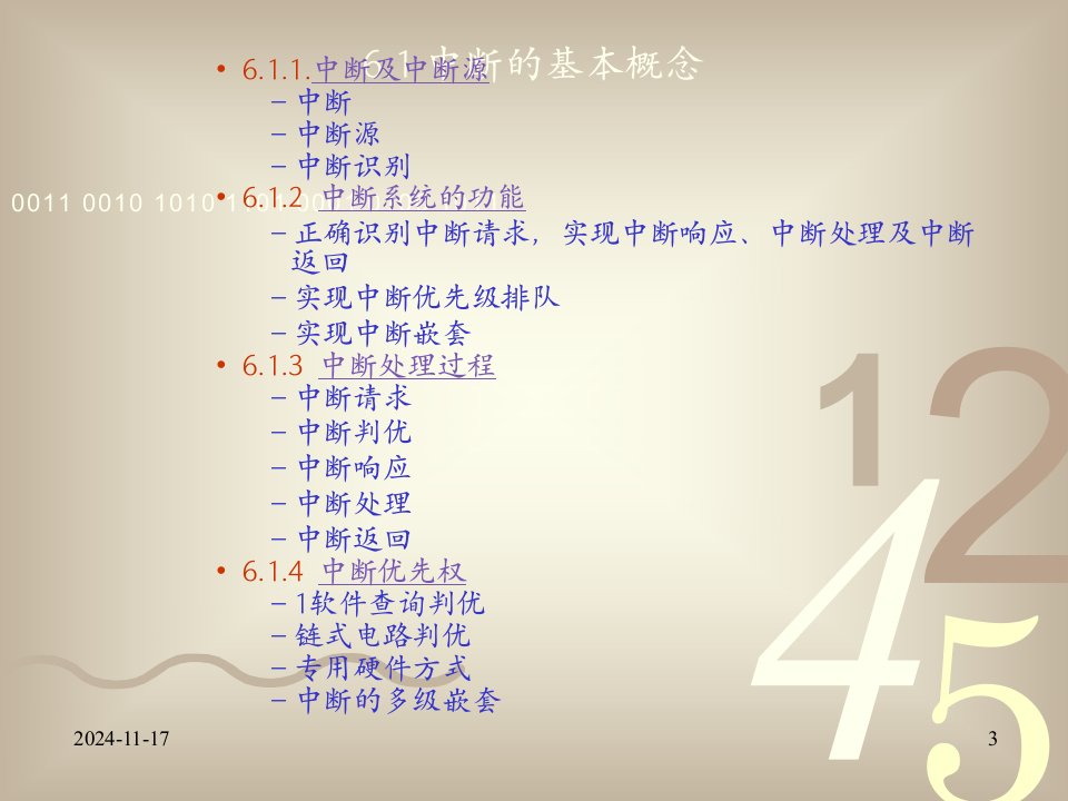 在CPU正常运行程序时,由于内部事件、外部事件或由程序预先安排的事件所引起的CPU暂时停止正在运行的程序,而转去执行请求CPU服务的内部/外部事件或预先安排事件的服务程序,待服务程序处理完毕后又返回去继续执行被暂停的程序。