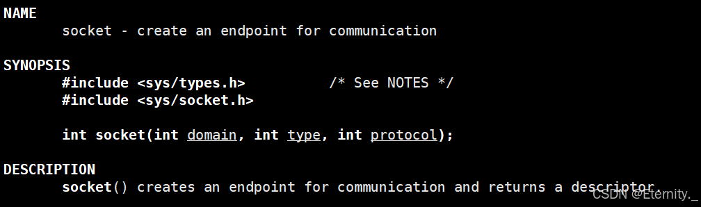 int socket(int domain, int type, int protocol);