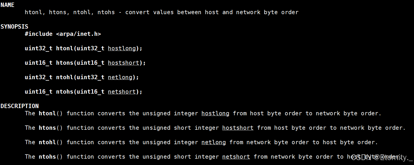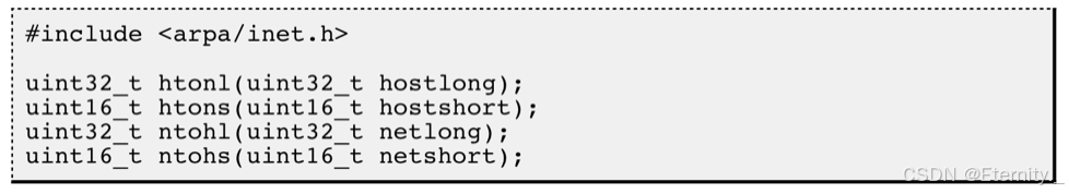 为使网络程序具有可移植性,使同样的C代码在大端和小端计算机上编译后都能正常运行,可以调用以下库函数做网络字节序和主机字节序的转换