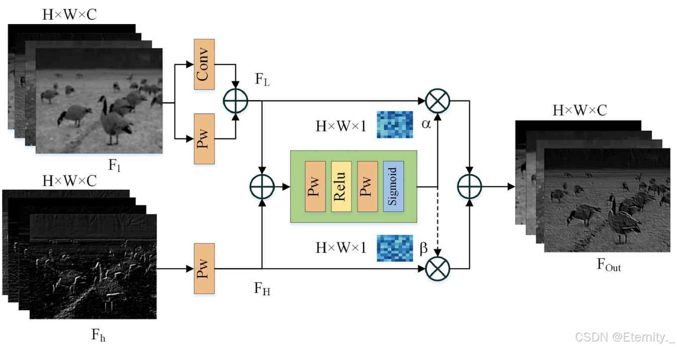 self.pw = nn.Conv2d(inchannels, outchannels, 1, padding=1)特征融合模块的结构如图4所示。文章里面说设计这个模块的原因是低级和高级特性在本质上是互补的,低级特征空间细节丰富,而高级特征更倾向于语义信息,将它们融合在一起通常有利于图像去雾。 这个模块的结构是将网络前面提取的特征图与网络后面得到的特征图进行融合,所以会有两个输入,Fl是网络前面部分得到的特征图,为低级浅层特征,而Fh为网络当前步骤得到的特征图,为高级特征,两者相加后的结果通过Point-Wise卷积和ReLU激活函数的夹心结构,最后利用Sigmoid函数得到低级和高级特征的权重。具体实现方法如下: