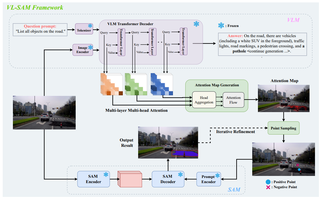 与此同时,在最近的研究中,大型视觉语言模型(VLM)显示出强大的物体识别泛化能力,例如,它可以在自动驾驶场景中的长尾数据上(corner case)识别非常见的物体,并给出准确的描述。然而,VLM 的定位能力相比于特定感知模型较弱,经常会漏检物体或给出错误的定位结果。另一方面,作为一个纯视觉基础模型,SAM 对来自许多不同领域的图像表现出良好的分割泛化能力。然而,SAM 无法为分割的对象提供类别。基于此,本文提出了一个无需训练的开放式目标检测和分割框架 VL-SAM,将现有的泛化物体识别模型 VLM 与泛化物体定位模型 SAM 相结合,利用注意力图作为中间提示进行连接,以解决开放式感知任务。