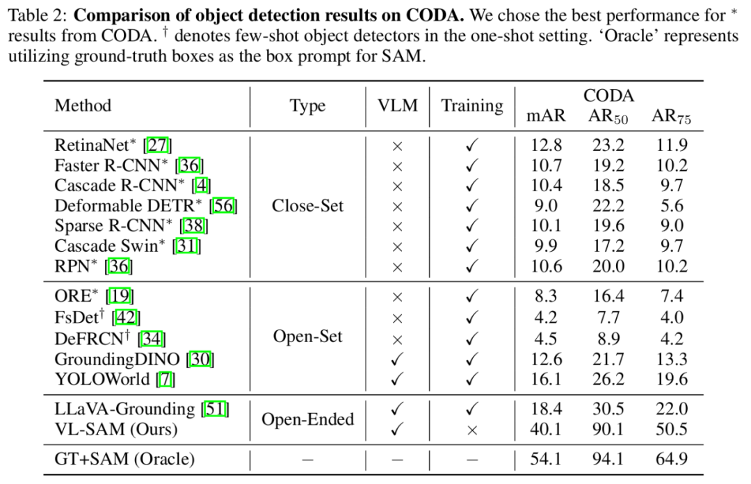 在自动驾驶场景 corner case 数据集 CODA 上,VL-SAM 也取得了不错的结果,超过了开集检测和开放式检测的方法。