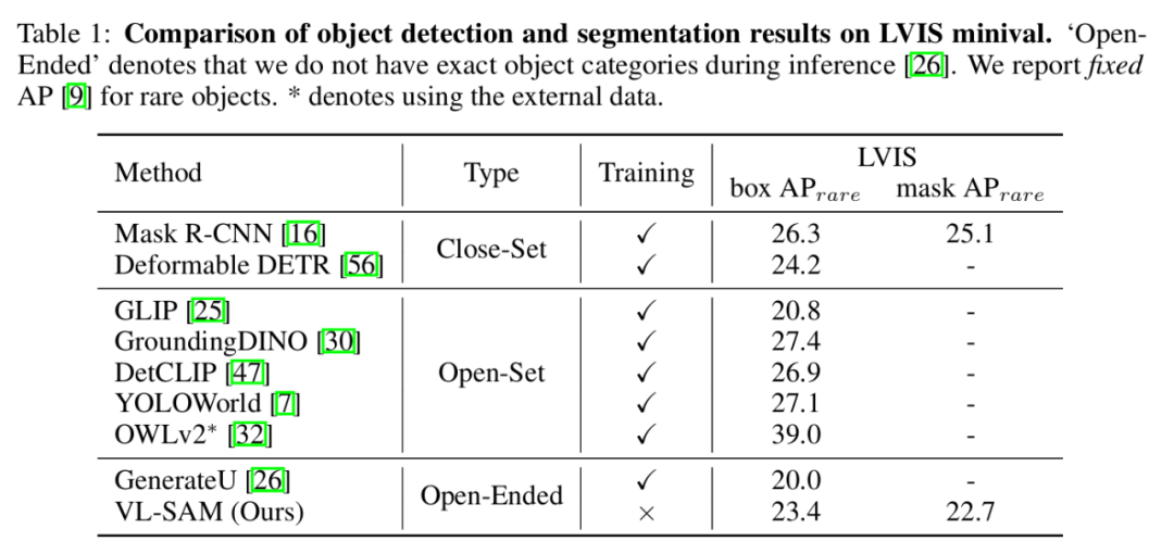 在包含 1203 类物体类别的长尾数据集 LVIS 验证集上,相比于之前的开放式方法,VL-SAM 取得了更高的包围框 AP 值。同时,VL-SAM 还能够获取物体分割结果。此外,相比于开集检测方法,VL-SAM 也取得了具有竞争力的性能。