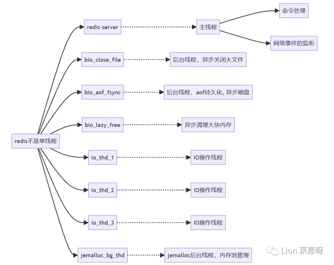 redis-server是主线程,所说的redis单线程主要指redis-server这个线程,用于处理命令。 对于单线程来说不能有耗时操作(所谓耗时是指阻塞IO或者CPU运算数据的时间比较长),对于redis而言耗时会影响响应性能。