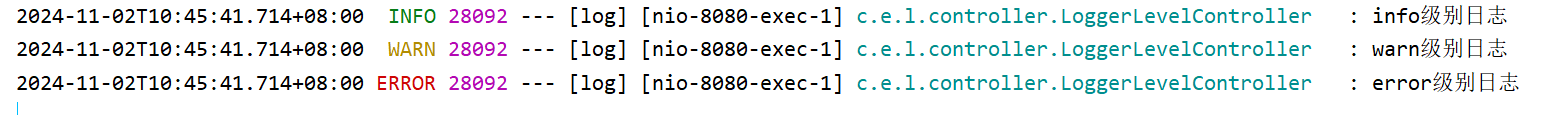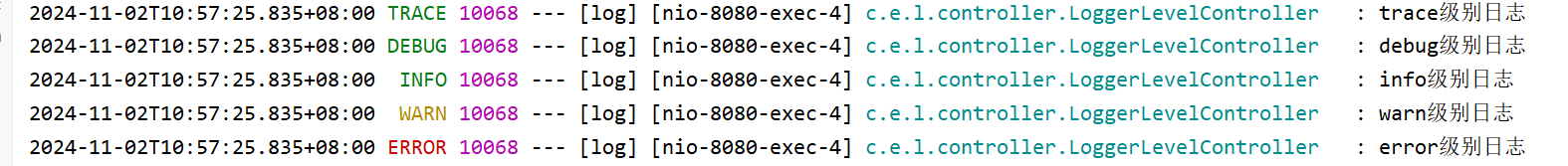 运行之后发现 debug 级别和 trace 级别的日志没有打印出来,这是因为默认配置的日志级别是 info 级别的,所以比 info 级别低的就打印不出来
