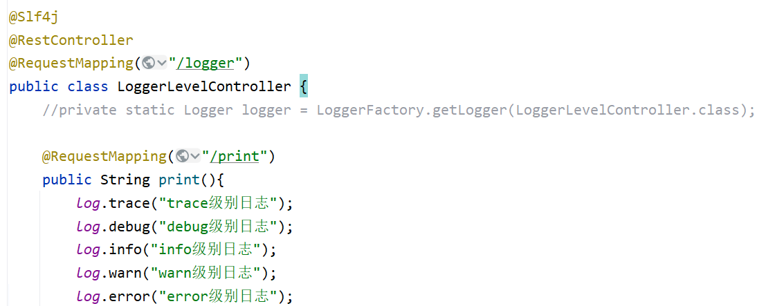 在程序中获取日志对象需要使用日志工厂 LoggerFactory,然后调用 getLogger 方法,传入参数用来标识这个日志的名称,这样可以更清晰的知道是哪个类输出的日志