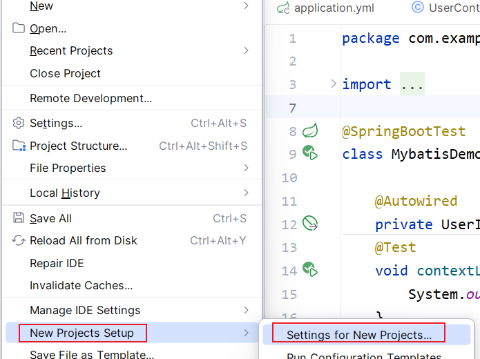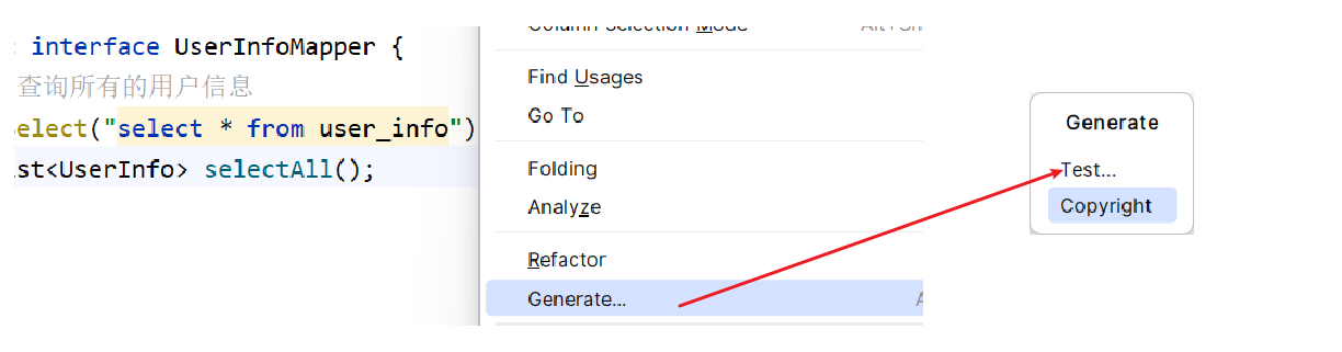 首先在需要测试的 Mapper 接口中右键之后点 Generate,然后再点 Test