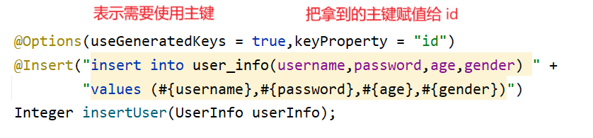 insert 语句默认返回的是影响的行数,如果想要获取自增 id 的话需要在方法上再加上一个@Options