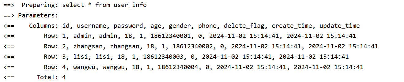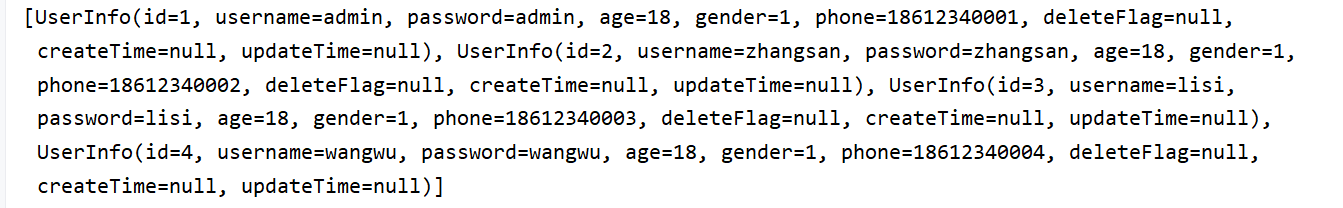 @Select("select id, username, password, age, gender, phone, delete_flag, create_time, update_time from user_info")