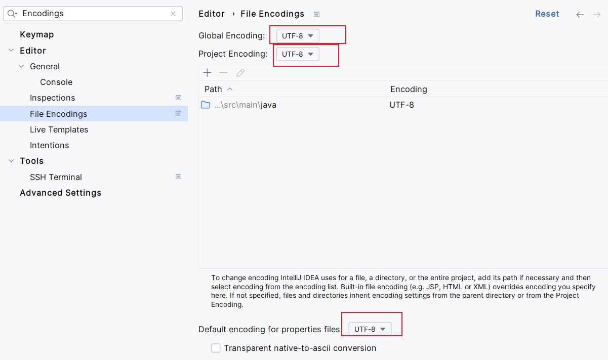 yml 配置文件中,可能中文会出现乱码,可以设置 idea 中的编码方式来避免乱码