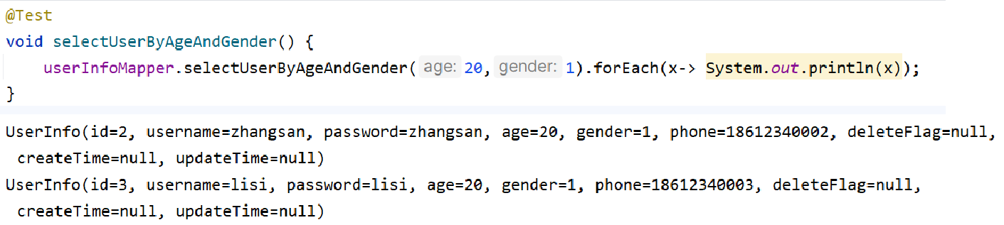 @Select("select * from user_info where age = #{age} and gender = #{gender}")