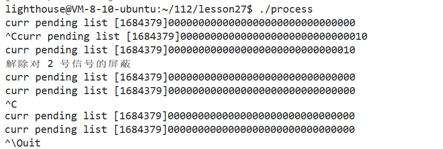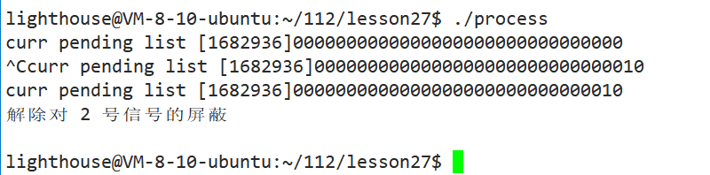 我们发现:后续输出没有了,原因:由于 2 号信号的默认动作是终止进程,一旦解除屏蔽,处理 2 号信号执行默认动作,就把自己干掉了,因此还需要做修改