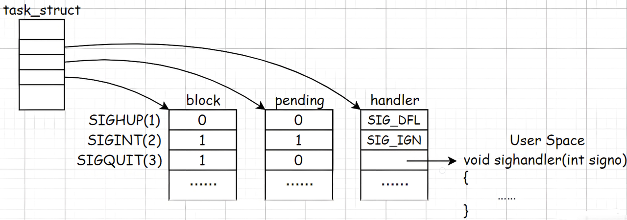 从上图来看,每个信号只有一个bit的未决标志,非0即1,不记录该信号产生了多少次,阻塞标志也是这样表示的。