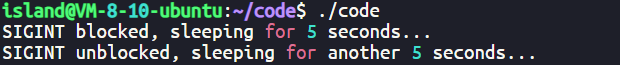 printf("SIGINT unblocked, sleeping for another 5 seconds...\n");