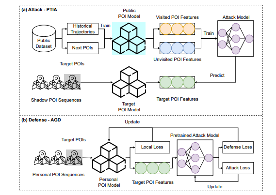摘要:作为基于位置的社交网络(LBSN)中不可或缺的个性化服务,兴趣点(POI)推荐旨在帮助个人发现有吸引力的地方。然而,精准推荐能力依赖于强大的服务器收集海量的用户历史签到数据,存在极大的隐私泄露风险。尽管一些用于 POI 推荐的协作学习 (CL) 框架增强了推荐弹性并允许用户将个人数据保留在设备上,但他们仍然共享个人知识以提高推荐性能,从而为潜在攻击者留下了漏洞。鉴于此,设计了一种新的物理轨迹推断攻击(PTIA)来暴露用户的历史轨迹。具体来说,对于每个用户,通过分析目标 POI 及其相关 POI 的聚合信息来识别交互的 POI 集。评估了 PTIA 在两个现实世界数据集上跨两种类型的去中心化 CL 框架进行 POI 推荐的有效性。实证结果表明,PTIA 对用户的历史轨迹构成了重大威胁。此外,本地差分隐私(LDP)作为 CL 框架的传统隐私保护方法,也被证明对 PTIA 无效。鉴于此,我们提出了一种基于对抗性博弈的针对 PTIA 的新型防御机制(AGD),以消除敏感 POI 及其相关 POI 中的信息。经过大量的实验,AGD被证明是精确和实用的,对推荐性能的影响最小。