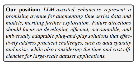 - LLMs可以作为数据和模型增强器、预测器以及下一代智能智能体,推动时间序列分析向更通用的智能系统发展。