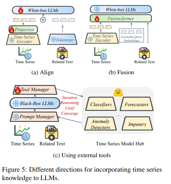 - 模型增强:将LLMs的知识转移到时间序列模型中,通过双塔模型等方法,利用LLMs的内部知识来提升时间序列模型的性能。