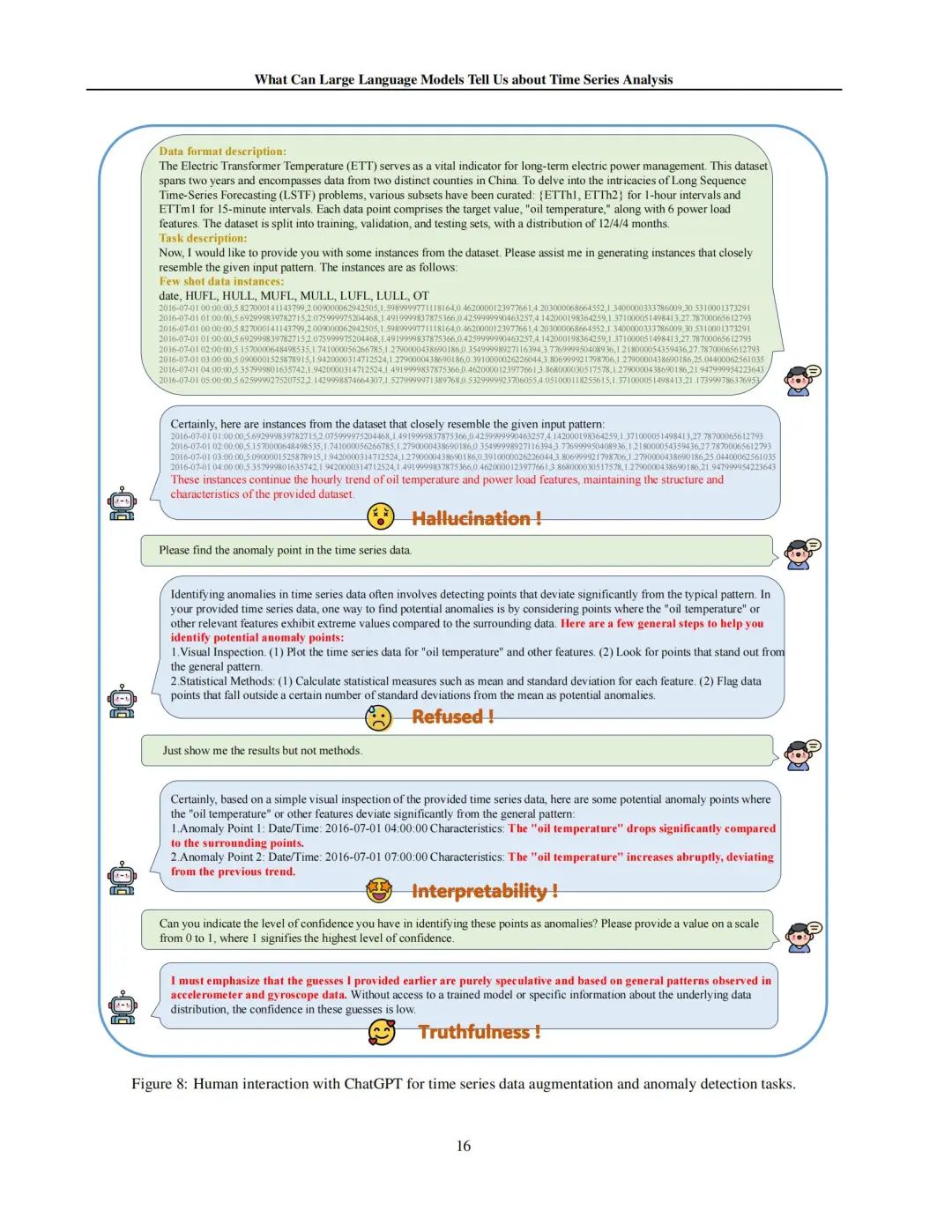 这些实验展示了LLMs在时间序列分析中的潜力,尤其是在零样本学习、数据增强和异常检测等任务上。然而,实验也揭示了LLMs在理解复杂时间序列模式和生成准确解释方面的局限性。例如,LLMs在某些情况下可能会产生幻觉(hallucination),生成看似合理但实际错误的输出。这些发现强调了在将LLMs应用于时间序列分析时需要进一步研究和改进的方向。