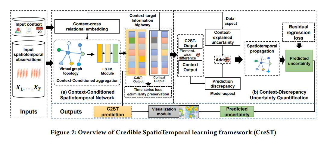 摘要:时空交通预测在智能交通系统中发挥着至关重要的作用,为多样化的城市服务提供支持。现有的流量预测框架通常设计各种学习策略来从流量本身的角度捕获时空相关性。然而,之前的流量预测仍然不可靠。首先,上下文因素交互对动态区域相关性的影响还在探索。其次,动态引发的预测可信度问题尚未得到充分探讨。在本文中,利用信息丰富的交通相关背景因素来共同解决动态区域异质性并解释随机性,以实现可靠的不确定性感知交通预测。具体来说,为了将动态上下文影响内化到学习过程中,设计了上下文交叉关系嵌入来捕获每个上下文之间的交互,并生成虚拟图拓扑以动态地将成对区域与上下文嵌入相关联。为了量化预测可信度,将数据不确定性(随机不确定性,aleatoric uncertainty)归因于上下文,并重新利用它们进行数据不确定性量化。然后,将具有相同目标的双管道(dual-pipeline)学习结合起来,以产生模型输出的差异并量化模型不确定性(认知不确定性,epistemic uncertainty)。这两个不确定性通过时空网络输入,用于提取不确定性演化模式。最后,全面的实验和模型部署证实了CreST框架的可信度。