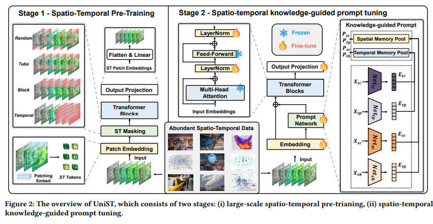 - 模型设计:UniST模型采用了基于Transformer的编码器-解码器架构,并通过时空标记器(Spatio-Temporal Tokenizers)处理多维时空数据。模型包括两个阶段:大规模时空预训练和时空知识引导的提示微调。