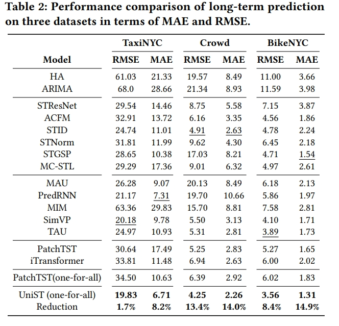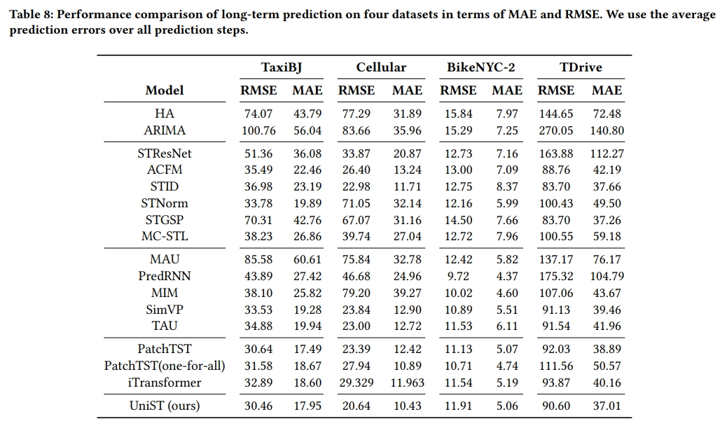 - 同样与其他模型进行比较,以展示UniST在长期预测任务上的性能。