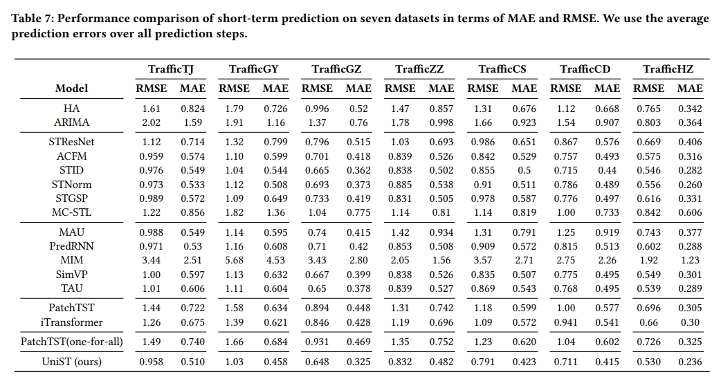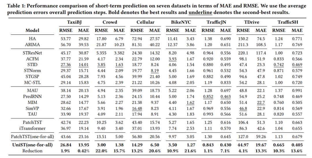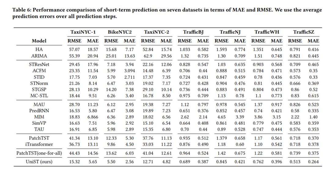 - 在多个时空数据集上评估UniST模型的短期预测性能。