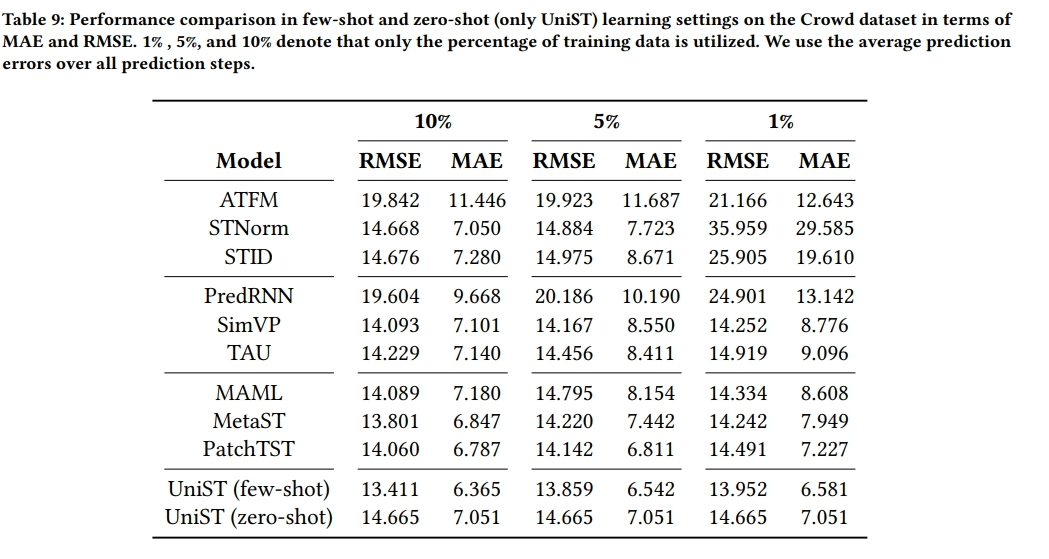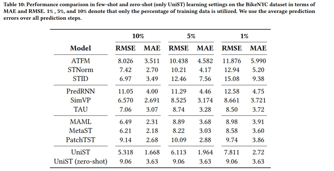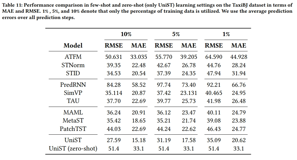 - 与小样本预测设置下的基线模型进行比较,以展示UniST的零样本学习能力。