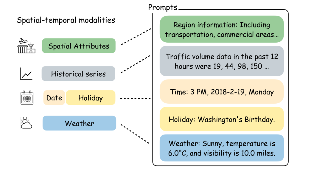 空间属性是从附近的POI、历史序列、外部因素中总结出来的,可以直接转换为自然语言