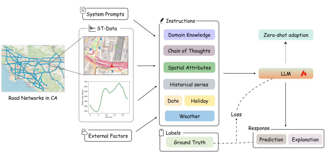 - 多模态数据的文本化:将交通流量数据、天气信息、兴趣点(POIs)等多模态数据转换为文本描述,作为LLMs的输入。这种转换使得数据的表达更加直观和易于理解。
