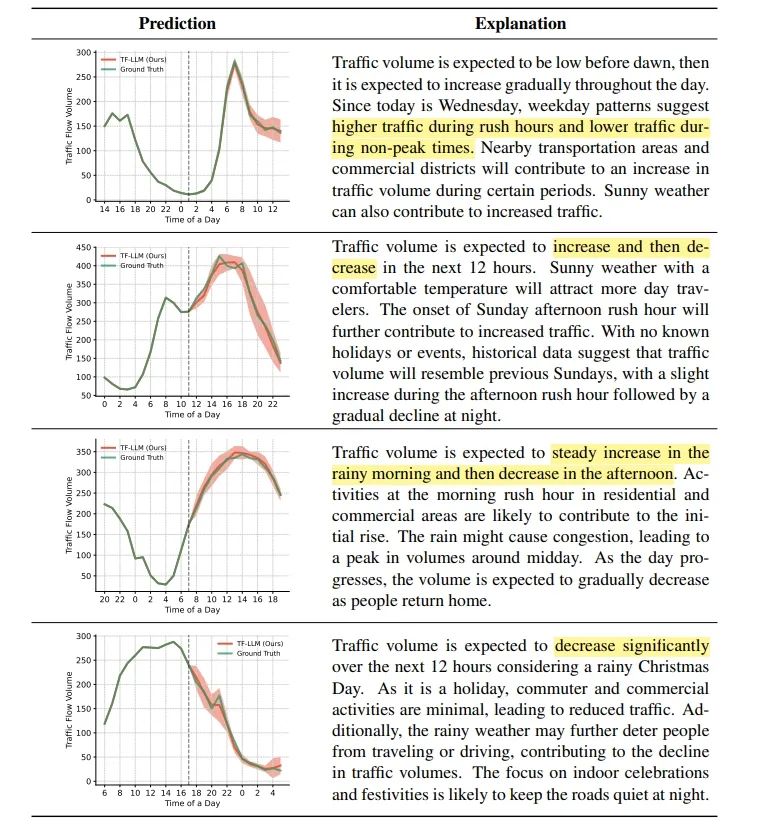 - 生成输入依赖性解释:TF-LLM能够生成输入依赖性解释,增强了预测的信心,并有助于决策者更好地理解预测结果。