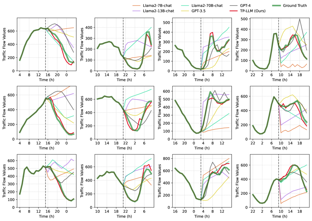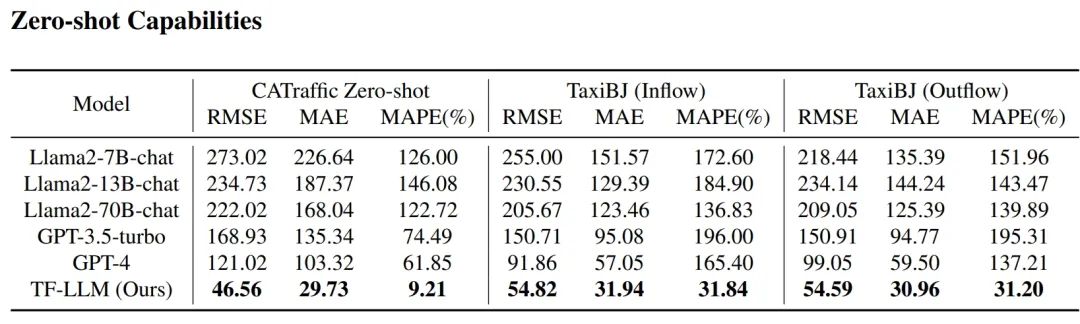- 零样本泛化能力:TF-LLM展示了在未见过的数据集上的预测能力,即使在没有针对特定城市动态进行训练的情况下,也能够进行准确的交通流量预测。