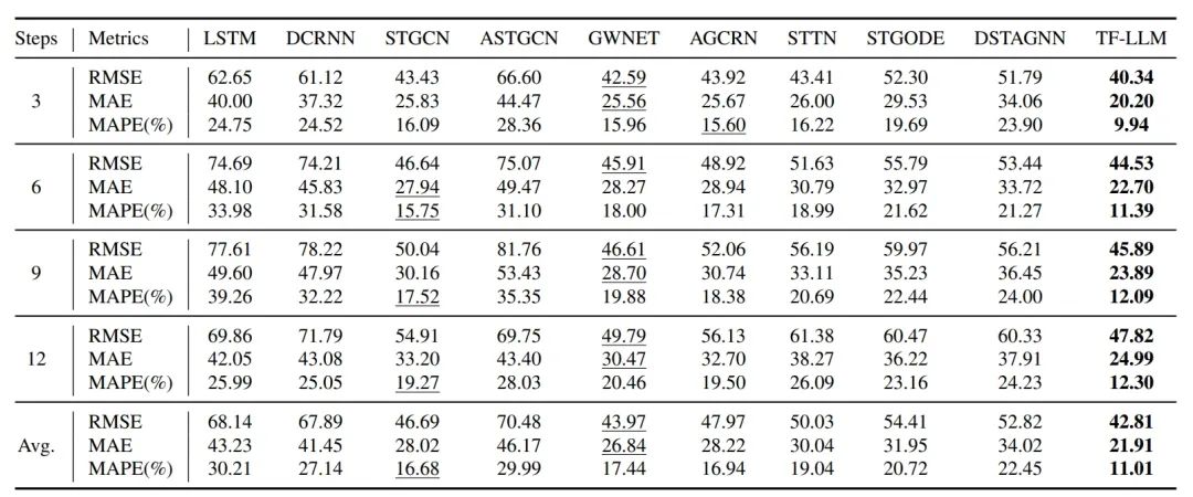 - 基线模型比较:将TF-LLM与多种先进的基线模型进行比较,包括LSTM、DCRNN、STGCN、ASTGCN、GWNET、AGCRN、STTN、STGODE和DSTAGNN(22ICML)等。(最新的比如PDFormer,STWave等暂时没有比较)