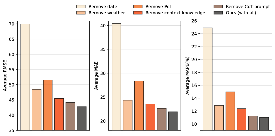 - 消融研究:通过移除输入提示中的不同部分(如日期、天气、POIs等),研究了这些因素对模型性能的影响。