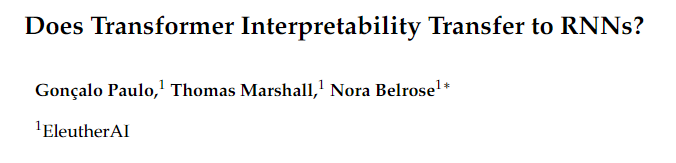 TL; DR:本文探讨了Transformer模型的解释性方法是否适用于新型循环神经网络(RNN)架构,并尝试通过对比激活添加、调整透镜和潜在知识提取等技术来增强RNN模型的解释性和控制性。