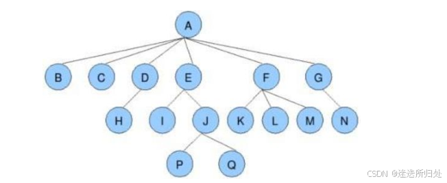 子孙:以某结点为根的子树中任一结点都称为该结点的子孙。如上图:所有节点都是A的子孙