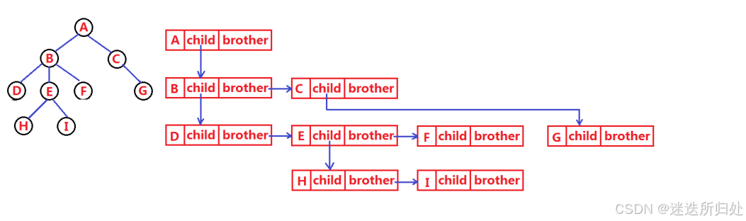 4.E指向子节点H,H指向兄弟节点I,I没有兄弟节点,指向空