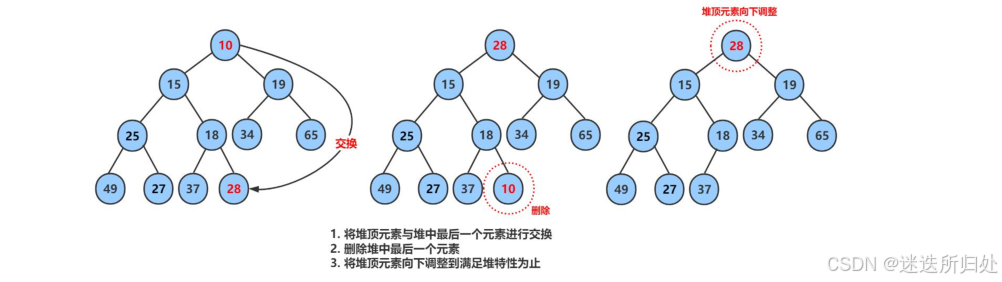 思路:排序删除:交换根和最后一个子节点的位置,再删除根,之后再进行向下调整算法(向下调整的前提是左右子树都是大小堆),然后根据左右子树的大小选择小的那个进行调整