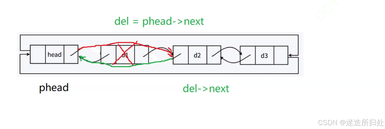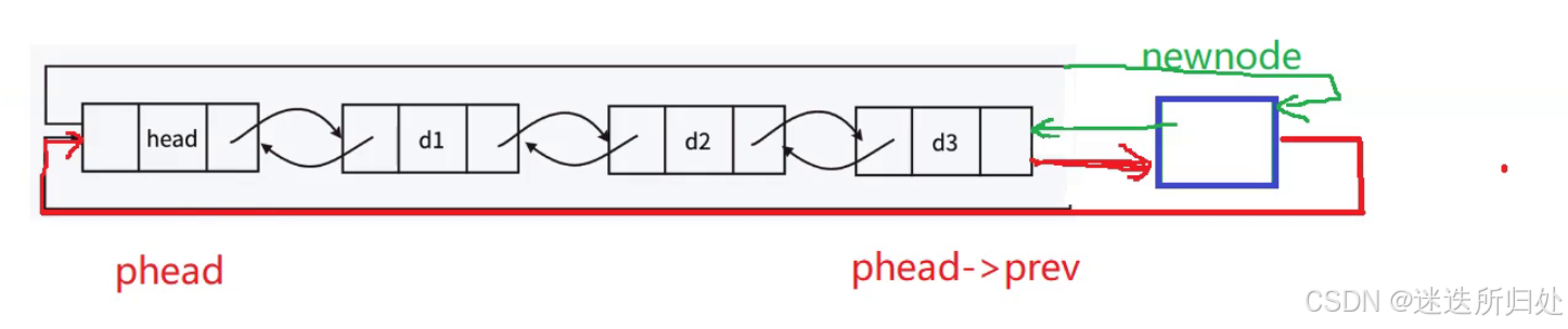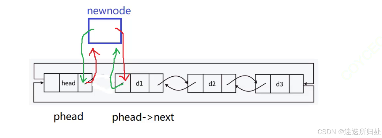 //phead newnode phead->next(第一个存储有效数据的节点d1)